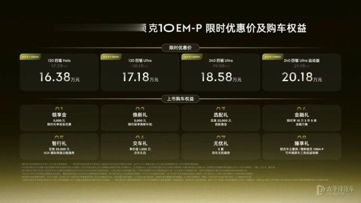 领克10 EM-P在9月8日上市,四款车型的售价区间为17.38-21.18万元,限时优惠价16.38-20.18万元。它是基于CMA Evo原生新能源架构打造,搭载1.5T全新电混引擎+DHTEvo混动电驱,系统综合功率390千瓦,纯电续航最高240km,并采用前双叉臂+后五连杆独立悬架。此外,领克10 EM-P还搭载英伟达Thor芯片和千里浩瀚智能辅助驾驶H7方案。