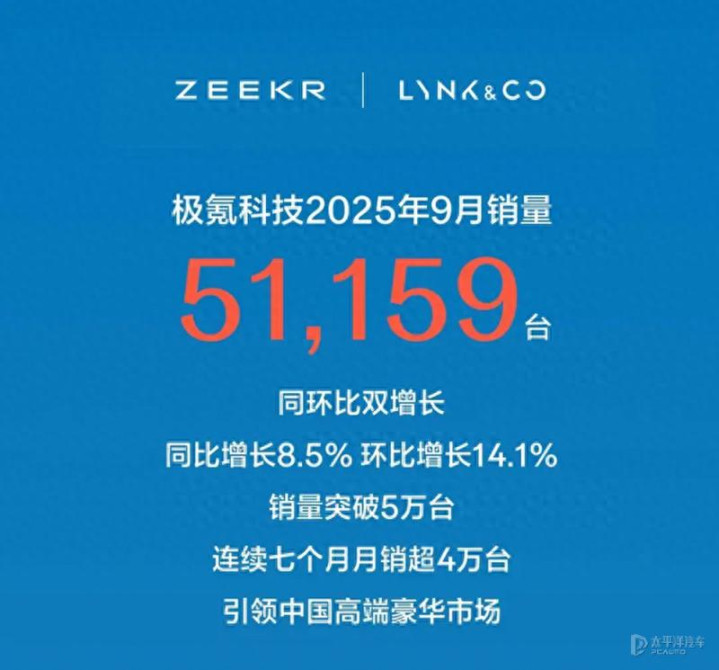 【太平洋汽车 行业频道】10月1日,极氪科技官方公布9月销量51159台,同比增长8.5%,环比增长14.1%,同环比双增长,连续7个月月销超4万台。其中极氪品牌9月销量18,257台,领克品牌9月销量32,902台。